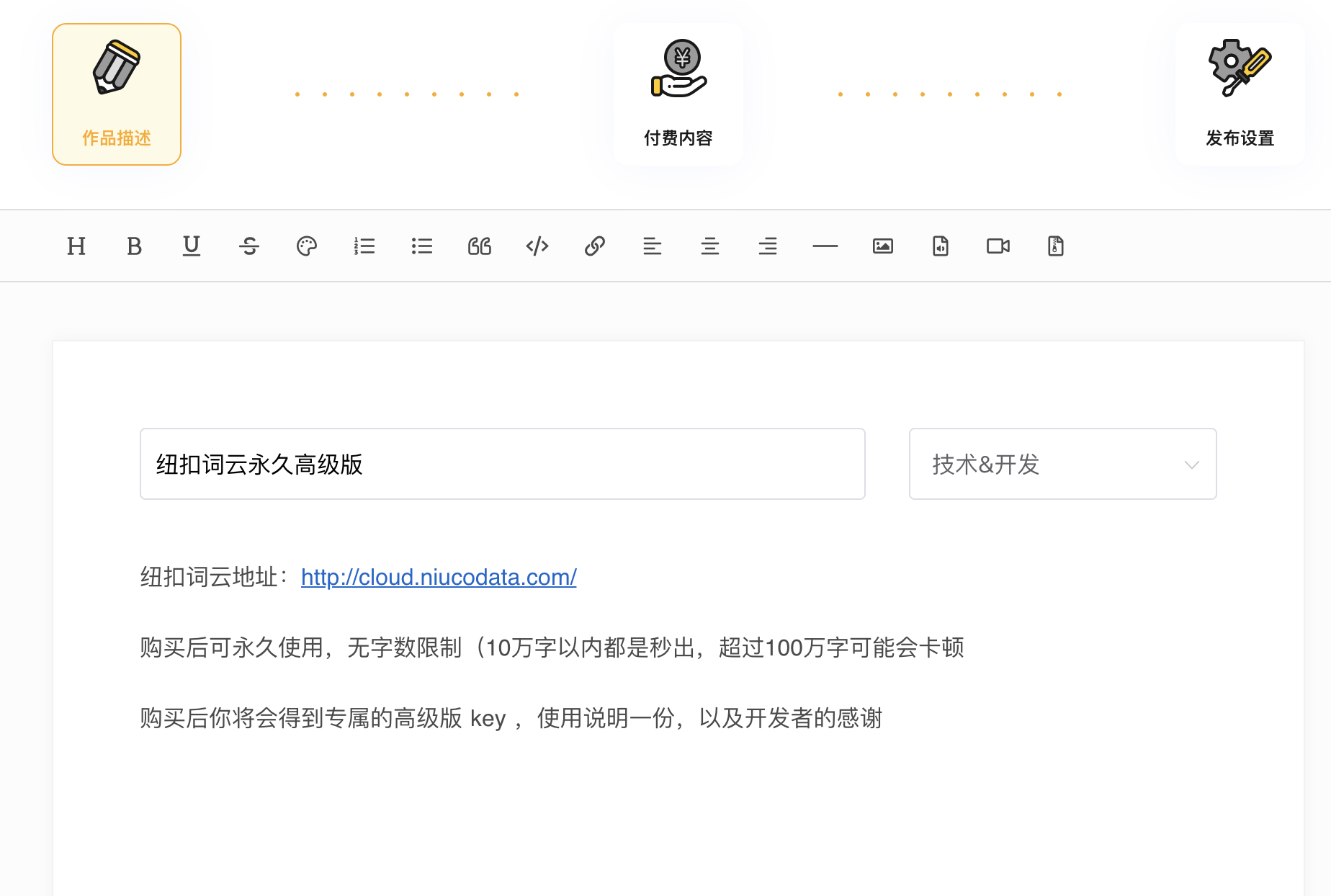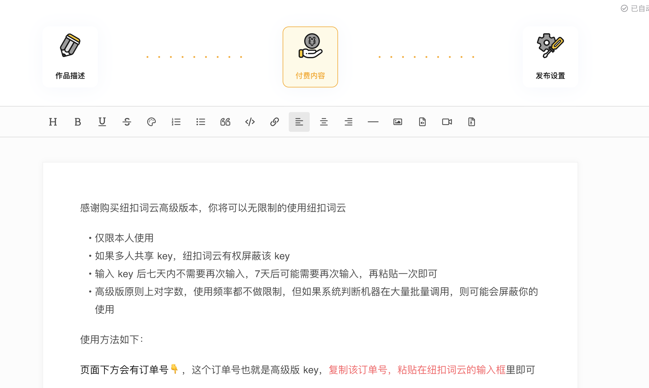 在面包多新建一个内容,设置好价格,描述和付费后可见内容,设置如下